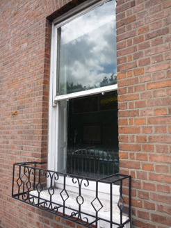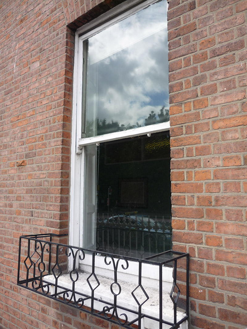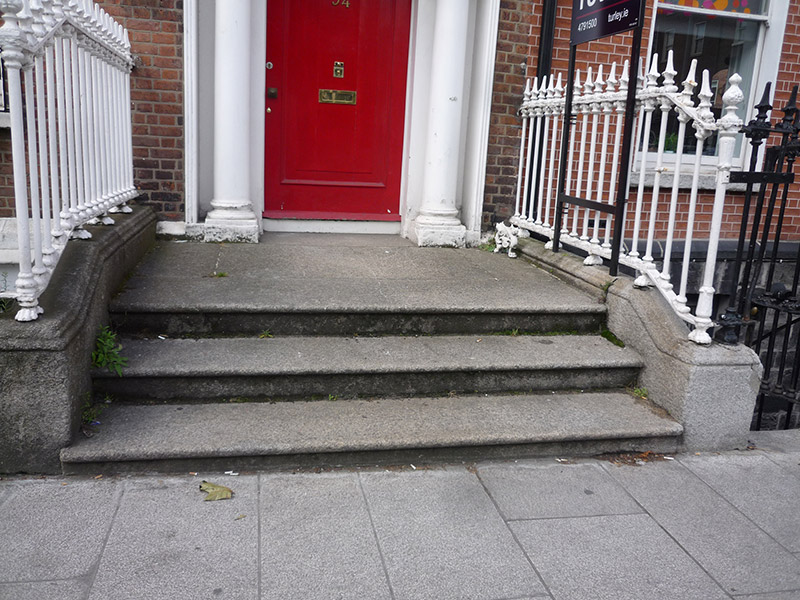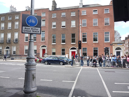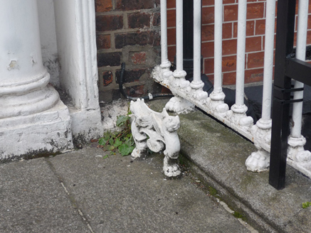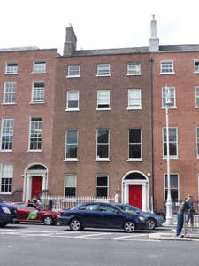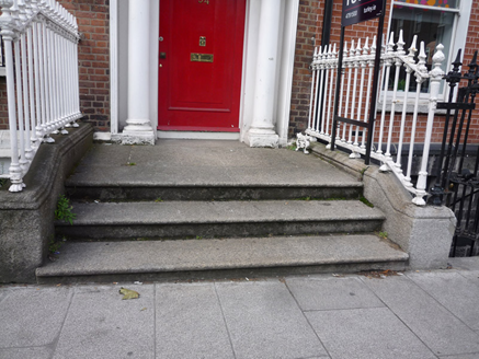 Attached three-bay four-storey former house over basement, built c. 1750, having shallow segmental bow to rear elevation. Now in office use. Slate roof, pitched to front part and with two hipped roofs to rear part, smaller to north and rounded to south. Large shared rendered chimneystacks with clay pots to party walls at front and to south end of rear, concealed rainwater goods, and reconstructed brown brick parapet wall with masonry coping. Flemish bond brown brick walling on painted granite plinth over painted rendered walling to basement; rendered to rear. Square-headed window openings, diminishing in height to upper floors, with painted granite sills and timber sliding sash windows, one-over-one pane with ogee horns, except for basement which has two-over-two pane windows with iron security grilles; timber sash windows to rear, tripartite to lower floors. Decorative wrought-iron vignettes to first floor openings. Segmental-headed door opening with moulded architrave, recessed painted masonry doorcase with partly engaged Doric columns supporting plain entablature, plain fanlight and single-panel timber door with weatherboard and brass furniture. Door opens onto granite platform bridging basement, with three bull-nosed steps to street level and cast-iron boot-scrape. Basement area enclosed by spear-headed cast-iron railings on moulded granite plinth wall. Separate entrance at south provides access to masonry staircase with replacement metal handrail. Replacement timber panelled door provides internal access below bridged platform. Casey (2005) notes that interior retains some early joinery, cornices and other elements. Carparking at rear.