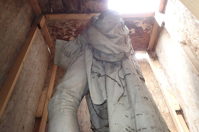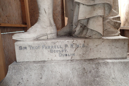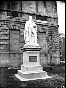 White marble statue, unveiled 1898 to memory of Robert Prescott Stewart (1825-1894), dressed in academic robes of doctor of music, resting right hand on harp and holding sheet of music in left. Monument stands at south side of National Gallery of Ireland, close to southeast corner. Inscription to base at right hand side reads 'Sir Thos. Farrell PRHA Sculp. Dublin'. Currently boxed in for protection during construction works at Leinster House.