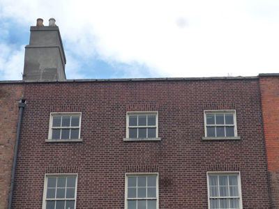 Attached three-bay four-storey former house over basement, built c. 1780, having shared two-stage rear return. Now in office use and currently under renovation. Natural slate roof, pitched to front part, behind reconstructed brown brick parapet having masonry coping, rear part has pitched roof to east shared with No. 31 and hipped roof to west, with painted rendered parapet. Shouldered rendered chimneystacks to west party wall with terracotta pots. Concealed gutters and replacement uPVC downpipes. Flemish bond brown brick walling, refaced above first floor sill level, having original colour-washed wig-pointed brickwork to ground floor on splayed granite plinth over partially painted rendered basement walling. Painted rendered walling to rear. Square-headed window openings, diminishing in height to upper floors, with painted rendered reveals, painted granite sills and timber sliding sash windows, one-over-one pane with horns to ground and first floors, six-over-six pane to second floor, three-over-three pane to top floor, basement openings blocked; generally six-over-six pane to rear. Decorative wrought-iron balconettes with cast-iron in-fills to first floor. Elliptical-headed door opening having tripartite painted masonry doorcase comprising engaged Adamesque Ionic columns with respond quarter-pilasters, stepped entablature with fluted and rosetted frieze, leaded petal fanlight and sidelights, and eight-panel timber door with weatherboard and brass furniture. Door opens onto concrete platform bridging basement with two steps to street level. Basement enclosed by wrought-iron railings with decorative wrought and cast-iron corner posts on moulded granite plinth. Separate entrance gate no longer in use and original stairs to basement removed. Basement to west end enclosed by concrete air raid shelter of c. 1940 with flat roof. Timber-sheeted door accesses interior below bridged platform. Casey (2005) notes survival of early joinery and plaster detailing. Rear of plot has carparking and boundary is mainly brick wall with segmental-arch vehicular entrance.