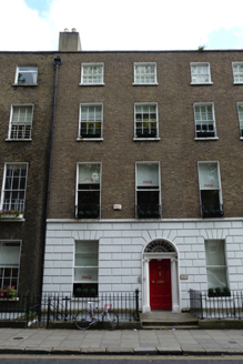 No. 38 Baggot Street Lower is a well-preserved late Georgian house with well-balanced proportions and graded fenestration pattern typical of the period. It was built, along with the neighbouring No. 39, in a grander style than many of the more modest houses on the street. Mirrored in the neighbouring buildings to each side, the brick façade of this building is ornamented with channelled rendering at ground floor level, adding additional architectural detailing to the group. It is enriched with a Greek Revival doorcase and an elaborate batwing fanlight. Further detail is provided by the window-guards. With its intact setting details, this building makes a strong contribution to the early streetscape character, which has been fairly well retained along this north stretch. The houses maintain a relatively uniform building height and design, with architectural variations attributable to individual developers. An ancient arterial route out of Dublin, Baggot Street was named for Robert Baggot, a local landowner, and it was laid out, with the approval of the Wide Streets Commissioners in 1791, from the west end in the late nineteenth century, but the street was slow to develop due to a recession at the time. The majority of the ground west of Fitzwilliam Street had been leased by 1789; the developer of the houses to the west of this junction was David Courtney.