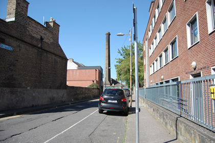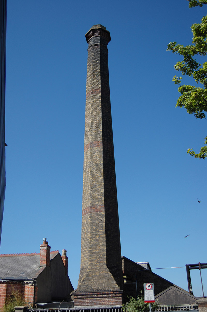 Freestanding octagonal-plan tapered boiler chimney, erected c. 1930, forming part of adjoining four-bay single-storey boiler house at east side. Now disused. Octagonal rendered chimney crown over stepped red brick cornice. Brown brick, laid in English bond, to walls, having red brick platbands. Square-profile red brick base with moulded brick cornice. Adjoining east elevation of boiler house, having hipped projections to east and west; pitched slate roof with clerestory vent, cut granite coping, rendered eaves course and cast-iron rainwater goods. Brown brick walls, laid in English bond. Semi-circular window openings, now blocked up, to upper part of east and west gables, above projections, with red brick voussoirs and chamfered granite sills. Square-headed window openings to front elevation of building with bipartite four-over-four pane timber sliding sash frames and chamfered granite sills square-headed doorways to same elevation, with battened timber doors. Adjoining pedestrian gateway having chamfered granite lintel and wrought-iron gate.