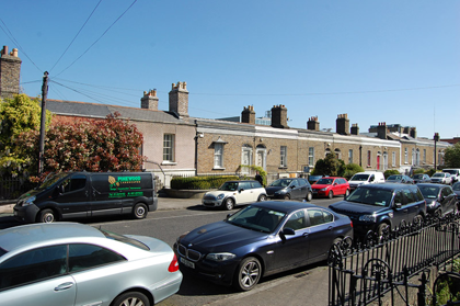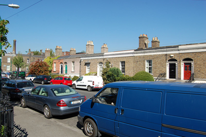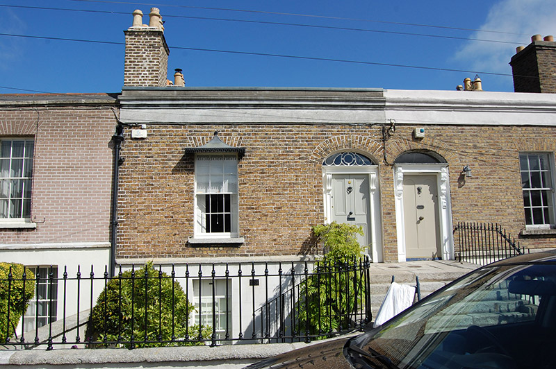 Terraced two-bay single-storey house over raised basement, built c. 1840. M-profile pitched slate roof having terracotta ridge tiles, shared chimneystack with clay pots, rendered parapet with cornice. Red brick, laid in Flemish bond to walls with cut granite plinth course over lined-and-ruled rendered wall to basement. Square-headed window openings having granite sills, rendered reveals and six-over-six pane timber sliding sash windows. Cast-iron window canopy over ground floor window. Elliptical-headed door opening with timber doorcase comprising panelled pilasters and scrolled console brackets supporting frieze, later timber panelled door and teardrop fanlight. Shared granite steps with cast-iron coal-hole cover and boot-scrape to platform. Basement area bounded by rendered plinth wall having cut granite coping surmounted by wrought-iron railings with decorative cast-iron collars, curved alignment to main entrance steps. Matching gate to basement level. Basement door beneath entrance steps. Set back from road, with basement-level front garden.