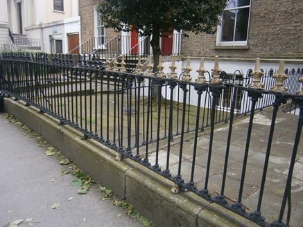 Terraced two-bay three-storey former house over basement, built c. 1830, as part of terrace of five. Now in commercial use. M-profile pitched roof, shared brick chimneystack with clay pots, brick parapet having carved granite cornice. Brown brick, laid in Flemish bond, to walls, with cut granite plinth course over lined-and-ruled rendered wall to basement. Square-headed window openings having granite sills, render reveals, six-over-six pane timber sliding sash windows. Cast-iron balconettes to first floor windows. Segmental-headed door opening with moulded render surround, stone doorcase comprising Doric columns supporting stepped cornice. Timber panelled door and cobweb fanlight. Nosed granite steps flanked by wrought-iron handrails having cast-iron boot-scrape to platform and coal hole cover to paved entrance path. Square-headed door opening beneath steps. Yard to front (north) elevation enclosed by cut granite plinth wall, surmounted by wrought-iron railings with decorative cast-iron spear-headed finials and claw feet. Matching gate having round-headed side panels with anthemion motif. Set back from street.