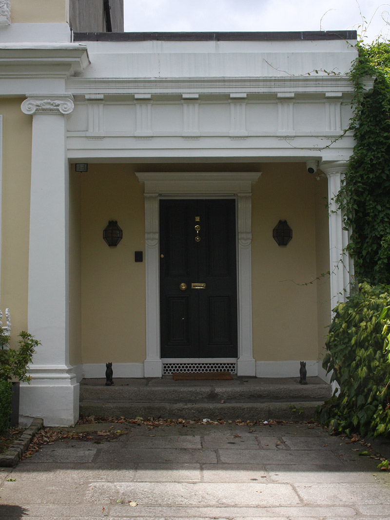Semi-detached two-bay three-storey house, built 1830, as one of pair, having basement and single-storey porch to side (north) elevation. M-profile hipped slate roof with terracotta ridge tiles, concealed by rendered parapet having stucco scrolls with anthropomorphic and foliate decoration. Rendered chimneystacks with clay pots. Hipped slate roof to porch, concealed by rendered parapet. Rendered walls, render details comprising pilasters to second floor, moulded cornices. Ionic pilasters to ground floor supporting moulded cornice, stone plinth course over basement. Fluted Doric columns supporting frieze having triglyphs and metopes, moulded cornice, to front of porch. Square-headed window openings with moulded render surrounds, those to first floor having scrolled consoles with moulded cornices and pediments. Stone sills to ground floor openings. Cast-iron railings with foliate motif to first and ground floor openings. Continuous masonry sill course to first and second floor windows openings. Three-over-three pane and six-over-six pane timber sliding sash windows. Recessed entrance to front of porch. Square-headed door opening having moulded render doorcase comprising panelled pilasters with scrolled consoles supporting stepped cornice, timber panelled door. Pair of cast-iron boot-scrapes to granite platform, granite steps. Square and segmental-headed door openings to basement. Cast-iron railings to front of house.