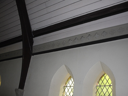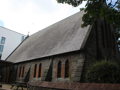Freestanding rectangular-plan single-cell gable-fronted former Irvingite church, built 1863, having shallow breakfront to front (northwest) and rear elevations, shallow gabled porch to front elevation, and recent structure attached to southeast corner. Pitched slate roof with carved granite coping and decorative finials having iron crosses to apexes. Snecked squared granite to walls, plinth course, with shouldered granite buttresses, those to side elevations having dressed limestone capping and quoins, painted platbands to southwest elevation. Pointed-arch window openings having tooled chamfered granite sills and polychrome brick surrounds, some with cast-iron railings, leaded windows. Pointed-arch polychrome brick supporting arch over window openings to front and rear elevations, carved trefoil panel to front elevation, carved quatrefoil panel to rear elevation. Gabled entrance porch to front elevation having carved granite coping with iron cross finial to apex. Pointed-arch door opening having carved stepped surround and polychrome brick voussoirs. Polished granite colonnettes with foliate capitals. Carved granite lettering to arch having foliate decoration, reading 'My house shall be called a house of prayer for all people'. Double-leaf timber battened door with iron fittings, granite step. Square-headed door openings to side (northeast) and rear elevations, timber doors. Double-leaf wrought-iron gates flanked by square-profile granite piers having red brick quoins, yellow brick platbands and cut stone pyramidal caps. Matching railings on rendered plinth wall. Located at a slight angle to Adelaide Road. Gabled hall to interior, openwork scissors truss ceiling, carved stone corbels with foliate and book motifs. Render cornice having quatrefoil motifs. Timber floor, some earthenware tiling. Timber pews, carved limestone font with quatrefoil motifs. Moulded pointed-arch to trio of windows over altar to rear elevation, having carved limestone corbels. Carved oak and cast-iron sanctuary rail with quatrefoil motifs. Carved square-plan limestone altar having cross motifs. Carved oak choir stalls.
