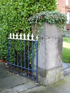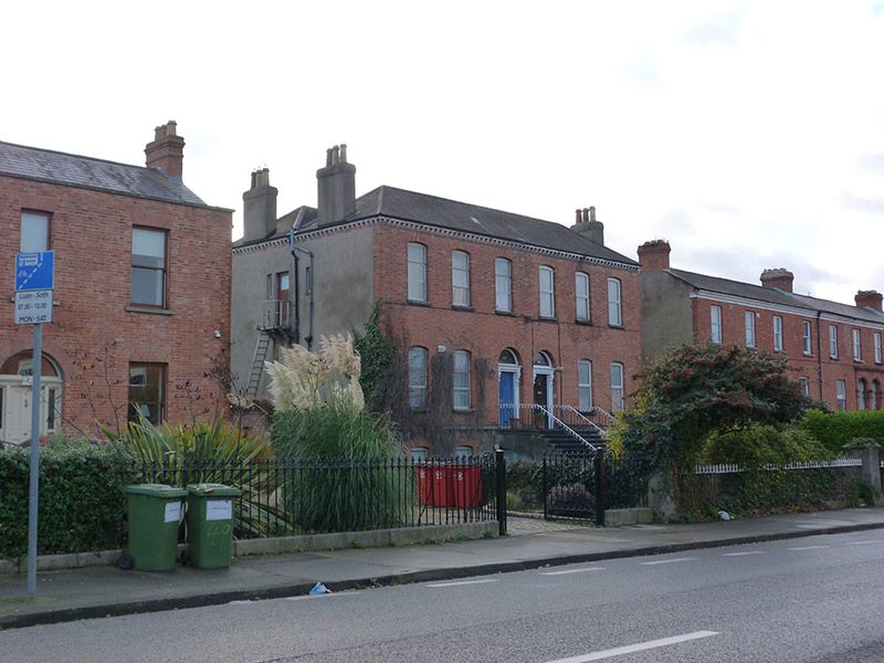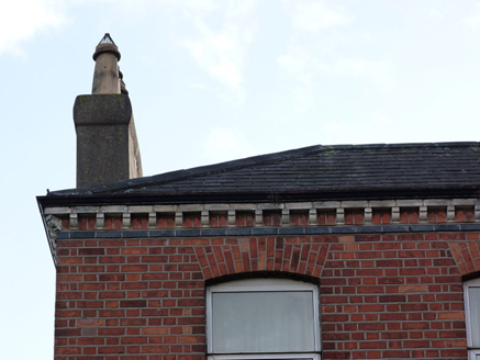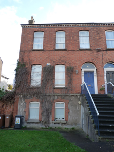 Semi-detached three-bay two-storey former house over raised basement, built c. 1870 as one of pair, having return to rear (southeast) elevation. Now in use as apartments. M-profile hipped slate roof with black clay ridge tiles, rendered chimneystacks with clay pots to northeast end, grey brick and corbelled white brick eaves course, profiled cast-iron rainwater goods to front and side elevations, replacement uPVC rainwater goods to latter, and having pitched roof apparent to return. Red brick walling to front, laid in Flemish bond to upper floors, on granite plinth course over rendered basement walling, having red brick at south end of basement facade; rendered walling to side and rear elevations. Camber-arch window openings with granite sills, having red brick surrounds to openings to basement, and with replacement uPVC frames throughout. Round-headed doorway with carved timber doorcase comprising panelled pilasters with scrolled brackets supporting cornice and plain fanlight, and carved timber panelled door. Entrance approached by shared flight of twelve nosed granite steps having felted platform, and decorative cast-iron handrails to each side. Decorative cast-iron bootscrape to platform. Garden to front, bounded by decorative cast-iron railings on carved granite plinth wall, with rendered square-plan piers to each end and to pedestrian gateway having granite capstones, with matching gate to front boundary. Rubble limestone boundary wall to southwest; red brick wall, continuing basement level to close off access to rear, with sawtooth brick cornice to parapet, and square-headed timber panelled door.