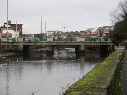 Three-span bridge, erected 1926, carrying road over River Tolka. Carved channelled render piers on rendered V-cutwaters with stringcourses, supporting flat-span concrete superstructure, with cast-iron railings having carved panelled Portland stone piers with carved capping to parapets and with lamp standards to end piers. Supported by rendered abutments to northeast and southwest, with carved Portland stone piers over channelled render plinths. Located at meeting of Ballybough, East Wall and Fairview Park.
