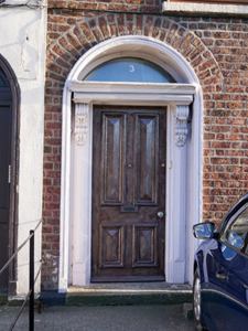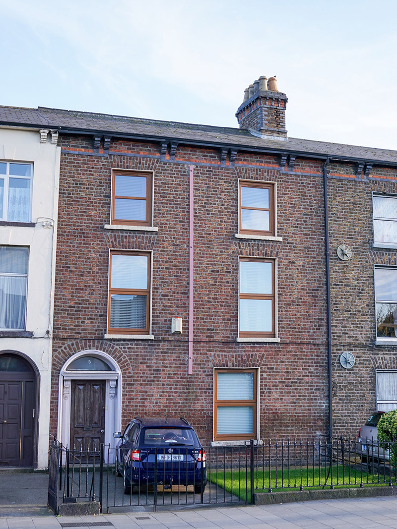 Terraced two-bay three-storey former house, built c. 1830 as one of terrace of five, having return to rear (east) elevation. Now in use as apartments. Pitched slate roof, having paired moulded clay brackets to eaves, red and blue brick eaves course, brown brick chimneystacks with red brick platband and blue brick detailing, replacement rainwater goods, and flat roof to return. Brown brick walling to front elevation, laid in Flemish bond, with vertical iron pattress plate between bays, and rendered walling to rear. Square-headed window openings with raised render reveals, granite sills, and replacement uPVC frames. Round-headed doorway with moulded render surround, panelled pilasters, scrolled brackets with acanthus leaf detail, stepped cornice, plain fanlight and four-panel timber door, fronted by granite step and rendered path with mild-steel railings. Cast-iron railings set on granite plinth wall to front boundary.