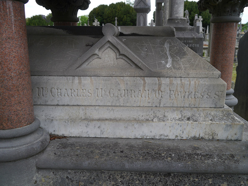 Freestanding High Gothic funerary monument, dated 1881, comprising white marble sarcophagus on stepped limestone plinth over granite base, with canopy roof above. Canopy is pitched limestone with cruciform pole-moulded ridge having carved cross final with marble hub; gable ends have cusped pointed arches, those to 'transepts' having marble hubs to blind quatrefoils; whole supported on pink granite columns having stiff-leaf capitals and moulded bases. Pole-moulding and Gothic panels with trefoil detail to sides of plinth, with marble studs and cavetto-moulding below. Inscription to sarcophagus reads ''Pray for the repose of the soul of Mr Charles McGauran of Fownes Street. Residence Chelmsford Road, Leeson Park. 5th April 1881 aged 61 years'. Set in Glasnevin Cemetery, south of O'Connell Circle.
