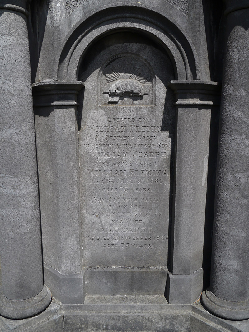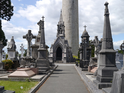 A classically styled funerary monument erected in the form of a belfry as the burial place of the Fleming family. It has a rather sober appearance, with a solid lower stage and openwork upper and displaying typical classical detailing. The monument is well proportioned and contributes to the stylistic variety of Glasnevin Cemetery, standing among a number of monuments of considerable architectural quality and craftsmanship. Originally known as Prospect Cemetery, the burial ground was opened in 1832 following a successful campaign by Daniel O'Connell, as a civic, non-denominational cemetery. It holds the graves and memorials of over one million people, including many notable citizens.