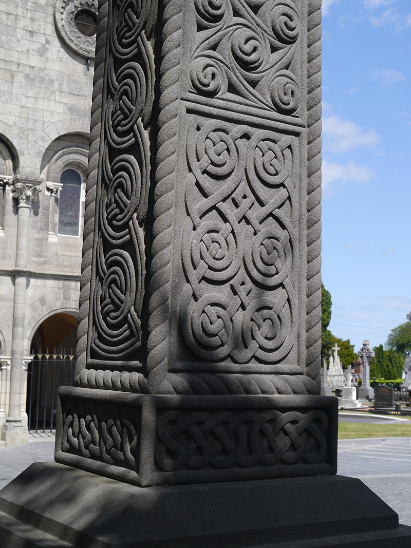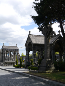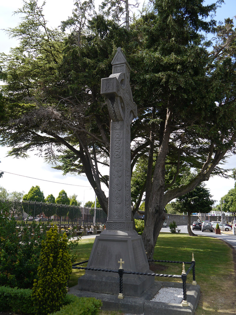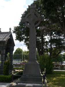 Freestanding limestone Celtic cross funerary monument, erected c. 1896, comprising stepped chamfered base and tapered plinth with memorial inscription to north face. Celtic cross profusely and differently enriched to all faces with spirals and interlacing, studs to each end and centre of head, and with house-shaped shrine-style top. Lowest panel of front face features series of six interlaced creatures biting tail of fellow to front. Gravelled enclosure having barley twist wrought-iron rail and piers, latter having cross finials, on chamfered limestone dwarf plinth wall. Located adjacent to south boundary of Glasnevin Cemetery.