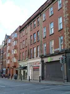 Terraced three-bay four-storey commercial building, built c. 1895 as part of group of three, having retail unit to ground floor with original shopfront. Pitched roof concealed behind balustraded parapet with moulded brick coping, terminated by red brick end-piers. Red brick chimneystack to south (rear), parapet gutters and recessed uPVC rainwater goods. Rendered and moulded platband above top floor openings, surmounted by moulded eaves cornice. Red brick walls laid in English garden wall bond with rendered quoins to east and west ends. Square-headed window openings, those of end bays being narrower, with brick voussoirs, granite sills and one-over-one pane timber sliding sash windows. Shopfront comprising central square-headed glazed door, flanked by replacement display windows and surmounted by narrow transoms with vinyl signage fascia. Pair of door openings to east side, surmounted by pediment over scrolled and panelled entablature. West door is flush metal with blocked transom, and east is six-panel timber. Ground floor surmounted by four timber-framed transoms with margin-lights, moulded cornice and fascia and framed by painted masonry pilasters topped with swan's-neck capitals.