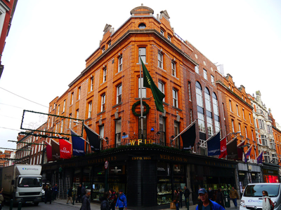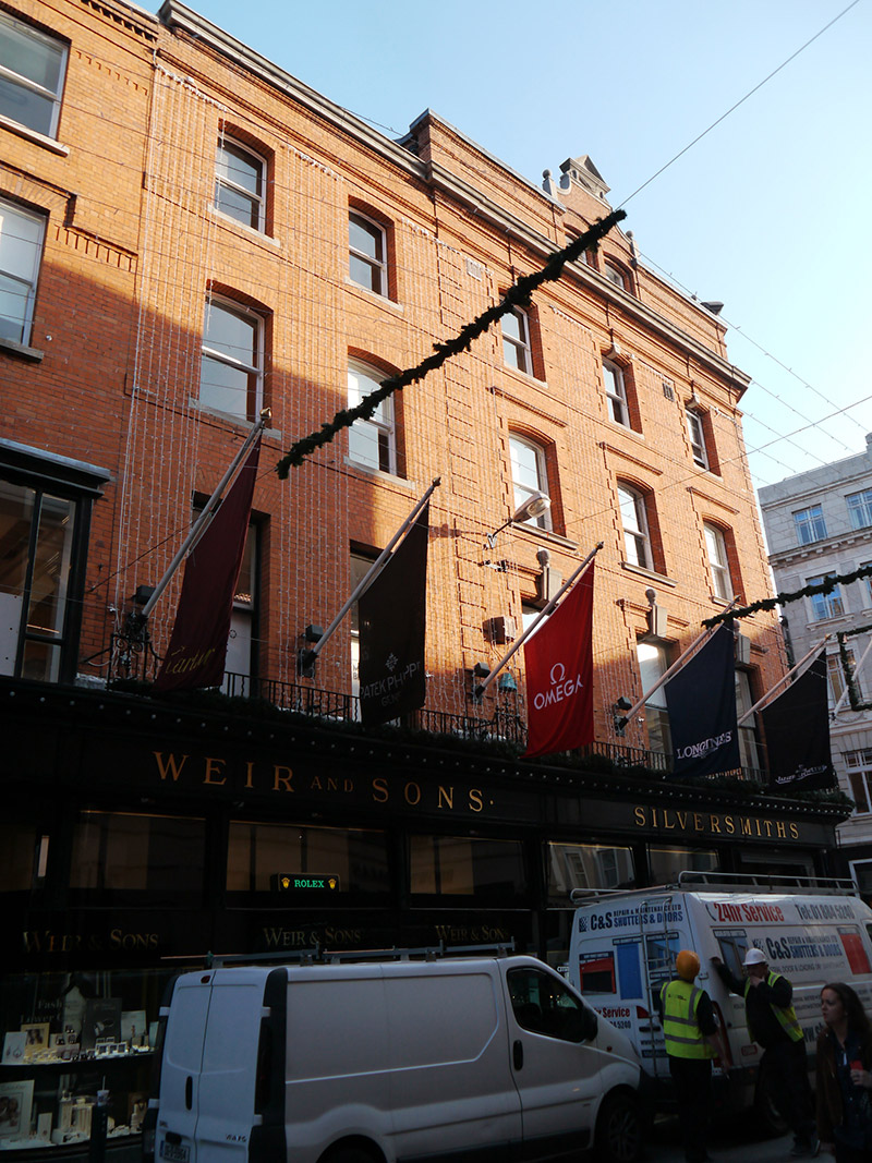 Corner-sited four-storey commercial building with dormer attic, built c. 1881, having canted corner bay, three-bay south elevation to Wicklow Street and two-bay to Grafton Street. In retail use, with offices over. Pitched roof, hipped to east end, with central gabled attic dormers to each elevation flanked by red brick parapet with dressed limestone coping. Concealed rainwater goods. Machine-made red brick walling, laid in Flemish bond, with raised stringcourses between floors and strip quoins to corners, rising to moulded brick eaves course, surmounted by projecting limestone (possibly granite) crown cornice, extending across neighbouring building to north. Square-headed window openings to first floor and segmental-headed to floors above, having raised brick block-and-start surrounds, bowtelll-moulded reveals, hood-cornices over first and second floor openings and spherical finials over limestone keys to first and third floors. Moulded limestone sills to second floor openings, and flush sills to third floor. Paired openings to shaped-gable attic dormers, having stepped reveals and continuous hood-mouldings, surmounted by swagged and panelled limestone frieze with matching copings and triangular pediments, flanked by spherical finial stops. Keyed oculus to corner bay with round pediment to parapet, topped by spherical finial. Windows are one-over-one pane timber sliding sash with ogee horns. Wraparound shopfront to ground floor, extending across Nos. 2-3 Wicklow Street and Nos. 97-99 Grafton Street, having continuous moulded fascia with raised lettering 'Weir and Sons/Silversmiths' to south, 'Estd. 1869' inset to southeast corner, 'Weir & Sons 96' to east, all surmounted by moulded modillioned cornice (curved to southeast corner), topped with decorative iron railings, raked to southeast and featuring 'Weir'. Timber display windows with overlights, curved to south and southeast elevations, subdivided by timber colonnettes (some faced with steel pieces) over polished black granite stall-riser. Early to mid-twentieth-century awning arms retained, extending over fascia. Recessed entrance porch to east bay of south elevation, flanked by convex curved display windows and having curved mirror to ceiling and mosaic paving to porch with contrasting granite trim 'Weir & Sons’. Square-headed door opening with timber and bevelled glass door, having brass handles and decorative frosted glass to lower section with lettering 'Weir & Son Manufacturing Silversmiths Jewellery/Showroom Grafton St'. Door set within moulded timber frame having carved timber swan's-neck pediment, and multiple-pane timber overlight with keyed oculus to centre set in shouldered timber architrave. Well-preserved interior, including fine plasterwork ceilings, frosted mirrors and freestanding oval display cabinets of c. 1935.