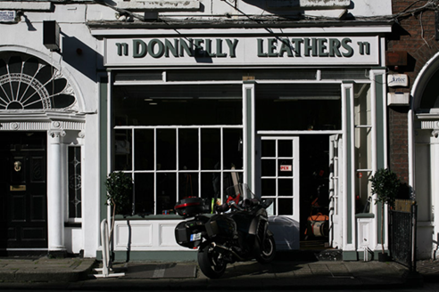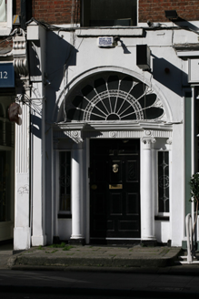 Terraced three-bay four-storey over concealed basement former townhouse, built c. 1800, with timber shopfront inserted to ground floor. Now in use as shop. Double-pile slate roof with M-profile ear pile set perpendicular to street and rendered chimneystacks to north party wall. Roof hidden behind parapet with granite coping. Red brick walls laid in Flemish bond with cement pointing, rebuilt to rear elevation in concrete brick. Gauged brick flat-arched window openings with masonry sills and replacement timber casement windows. Rendered ground floor with timber shopfront comprising large multi-pane timber display window and double-leaf timber glazed doors all flanked by flat-panelled pilasters with timber fascia and lead-lined hood cornice. Gauged brick round-headed door opening with masonry Ionic doorcase comprising historic timber door with ten raised-and-fielded panels and brass door furniture flanked by engaged Ionic columns, decorative lead sidelights, and further Ionic pilasters, all supporting stepped and fluted lintel cornice with decorative leaded fanlight. Door and shop entrance open onto granite paved platform leading directly to street.