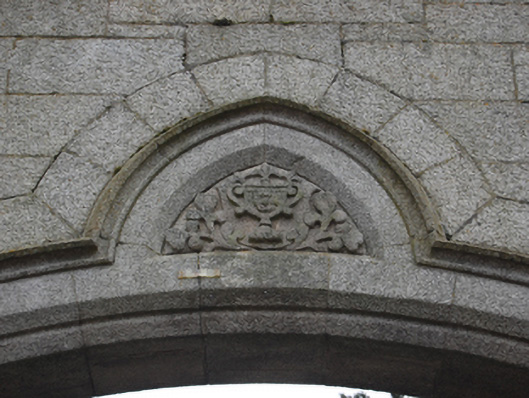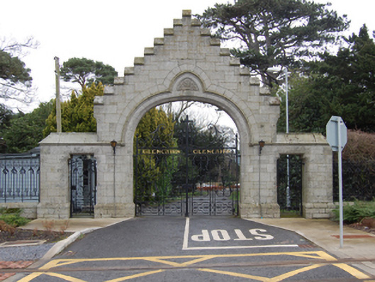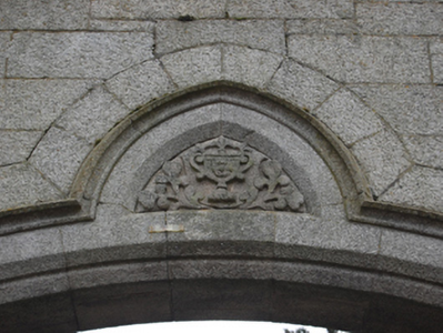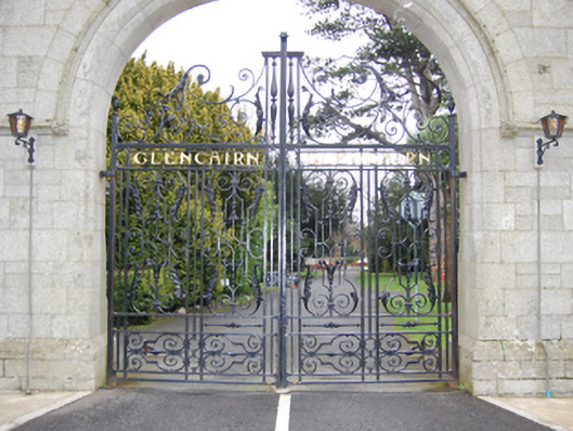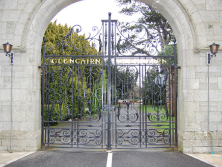 Gateway, extant 1908, on a symmetrical plan. Snecked granite wall on cut-granite chamfered cushion course on granite ashlar plinth with cut-granite coping to crow stepped parapet on cut-granite "Cavetto" kneelers. Elliptical-headed central opening, cut-granite block-and-start surround having chamfered rebated reveals with hood moulding on foliate label stops framing wrought iron double gates. Shouldered square-headed flanking openings with cut-granite block-and-start surrounds having chamfered reveals framing wrought iron gates. Road fronted at entrance to grounds of Glencairn.
