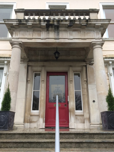 Detached three-bay two-storey over basement country house, built 1796, on a T-shaped plan centred on (single-storey) prostyle distyle Doric portico to ground floor; three-bay two-storey side elevations. Sold, 1830. Resold, 1837. Resold, 1861. "Improved", 1861-2, producing present composition. Sold, 1877. Occupied, 1911. Adapted to alternative use, 1917. Adapted to alternative use, 1979. Hipped slate roof on a U-shaped plan behind parapet with clay ridge tiles, paired rendered central chimney stacks having stringcourses below cut-granite capping supporting yellow terracotta octagonal pots, and concealed rainwater goods. Rendered channelled walls (ground floor) on moulded rendered cushion course on rendered, ruled and lined plinth; rendered, ruled and lined surface finish (first floor) with cut-granite "Cyma Recta"- or "Cyma Reversa"-detailed cornice below balustraded parapet. Square-headed central door opening in tripartite arrangement behind (single-storey) prostyle distyle Doric portico approached by flight of eleven cut-granite steps with cut-Portland stone columns on padstones having responsive pilasters supporting modillioned "Cyma Recta"- or "Cyma Reversa"-detailed cornice on triglyph-detailed frieze on entablature below balustraded parapet, cut-Portland stone doorcase with monolithic pilasters on padstones supporting shallow cornice on blind frieze on fluted scroll consoles framing glazed timber panelled door having fixed-pane sidelights. Square-headed window openings (ground floor) with cut-granite sills on panelled risers, and rendered surrounds with "Cyma Recta"- or "Cyma Reversa"-detailed hood mouldings on nailhead-detailed consoles framing one-over-one timber sash windows. Square-headed window openings (first floor) with sill course, and moulded rendered surrounds framing one-over-one timber sash windows. Square-headed central window openings to rear (west) elevation with cut-granite sills, and concealed dressings framing six-over-six (ground floor) or one-over-one (first floor) timber sash windows. Interior including (ground floor): central hall retaining carved timber surrounds to door openings framing timber panelled doors, decorative plasterwork cornice to ceiling centred on "Acanthus"-detailed ceiling rose, staircase on an Imperial plan with cast-iron balusters supporting carved timber banisters terminating in volutes, carved timber surrounds to door openings to landing framing timber panelled doors, and decorative plasterwork cornice to ceiling centred on "Acanthus"-detailed ceiling rose; reception room (south) retaining carved timber surround to door opening framing timber panelled door with carved timber surrounds to window openings framing timber panelled shutters, and decorative plasterwork cornice to ceiling centred on decorative plasterwork ceiling rose; reception room (north) retaining carved timber surround to door opening framing timber panelled door with carved timber surrounds to window openings framing timber panelled shutters, and decorative plasterwork cornice to ceiling centred on decorative plasterwork ceiling rose; and carved timber surrounds to door openings to remainder framing timber panelled doors with carved timber surrounds to window openings framing timber panelled shutters. Set in relandscaped grounds.