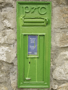 Wall-mounted cast-iron "wall box" post box, between 1939-62, with "P7T [Posts and Telegraphs]" monogram. Now disused. Set in coursed rubble granite boundary wall.
