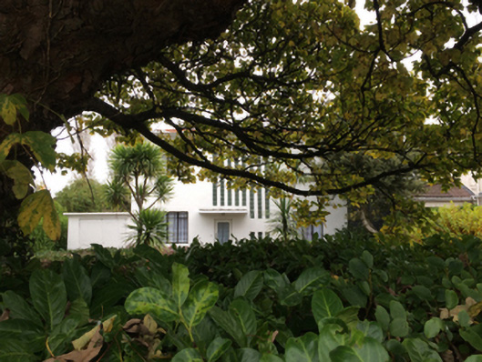 Detached three-bay two-storey flat-roofed house, built 1950; extant 1953, on an L-shaped plan with single-bay (north) or two-bay (south) two-storey side elevations. One of a pair. Bitumen felt-covered flat roof with overhanging concrete or rendered eaves. Rendered walls. Square-headed central door opening with concrete step threshold, and concealed dressings with cantilevered reinforced concrete canopy framing glazed timber door. Grouped square-headed strip openings (first floor) with concealed dressings framing glass block inserts. Square-headed window openings with concealed dressings framing steel casement windows. Set in landscaped grounds with rendered piers to perimeter having stringcourses below pyramidal capping supporting iron double gates.
