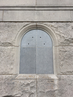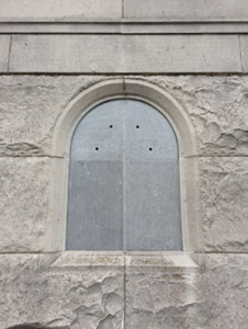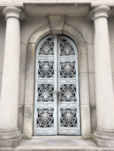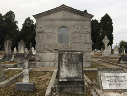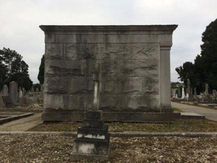 Freestanding single-bay single-storey pedimented mausoleum, dated 1911, on a rectangular plan. Pitched (gable-fronted) slate roof with ridge tiles. Tuck pointed drag edged rock faced limestone ashlar walls on dragged edged cut-limestone chamfered plinth with dragged cut-limestone "Cyma Recta" or "Cyma Reversa" cornice on blind frieze; limestone ashlar surface finish (west) on drag edged cut-limestone plinth with dragged cut-limestone pilasters centred on dragged cut-limestone columns supporting dragged cut-limestone "Cyma Recta" or "Cyma Reversa" pediment on embossed frieze. Round-headed door opening with dragged cut-limestone monolithic surround centred on drag edged dragged cut-limestone keystone framing cast-iron double doors. Round-headed opening (east) with dragged cut-limestone surround having chamfered reveals framing perforated galvanised steel fitting. Set in landscaped grounds.