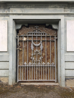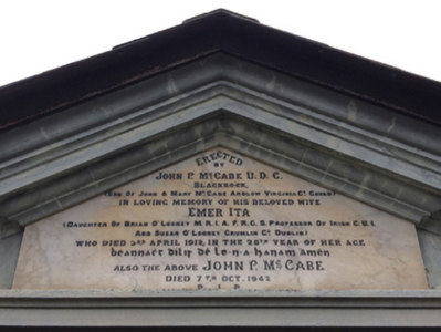 A mausoleum erected by John Patrick McCabe (d. 1942) of Blackrock contributing positively to the group and setting values of Deans Grange Cemetery with the architectural value of the composition suggested by such attributes as the compact rectilinear plan form; the pilastered temple front centred on a restrained doorcase showing shamrock-detailed iron work; and the pedimented roofline.