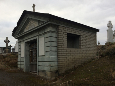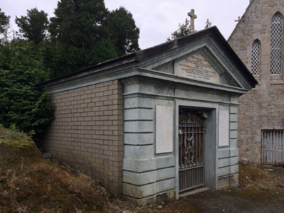 Freestanding single-bay single-storey pedimented mausoleum, dated 1912, on a rectangular plan. Pitched (gable-fronted) slate roof, clay ridge tiles with Cross finial to apex, timber bargeboards to gables, and timber eaves boards on "Cyma Recta"- or "Cyma Reversa"-detailed cornice. Grey brick Running bond walls; rendered surface finish (north) on rendered channelled base on submerged rendered chamfered plinth with rendered channelled pilasters to corners supporting "Cyma Recta"- or "Cyma Reversa"-detailed pediment on panelled frieze on "Cavetto" stringcourse. Pair of blind panels centred on square-headed door opening with rendered surround having stepped reveals framing shamrock-detailed cast-iron gate. Set in landscaped grounds.