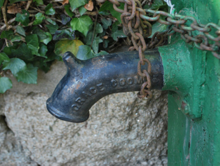 A "cow tail" waterpump supplied by John P. Grace of The Liberty Saw Mills, The Coombe, representing an interesting example of street furniture making a pleasing, if largely inconspicuous visual statement in a sylvan street scene.