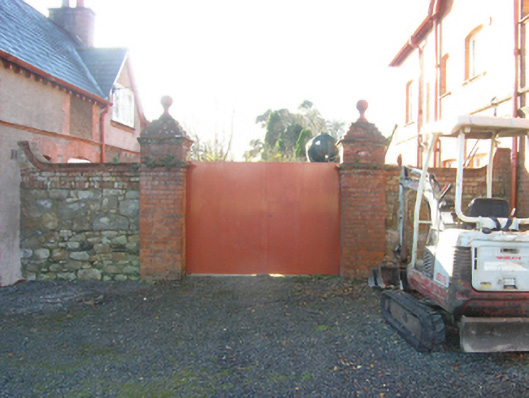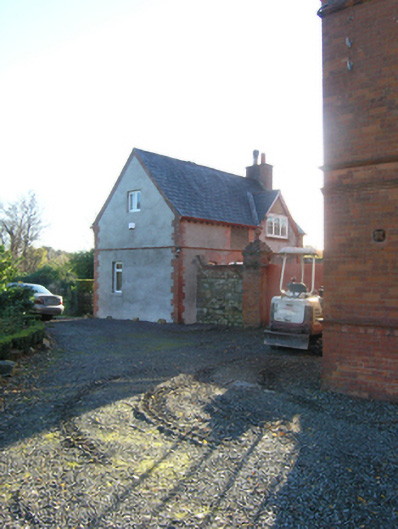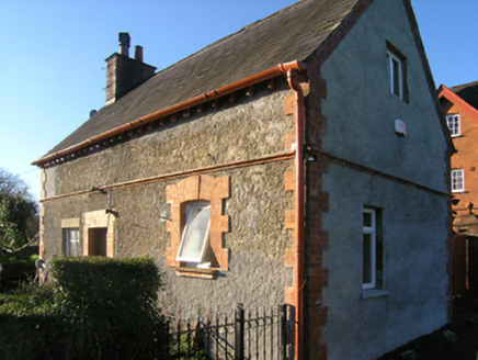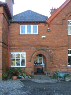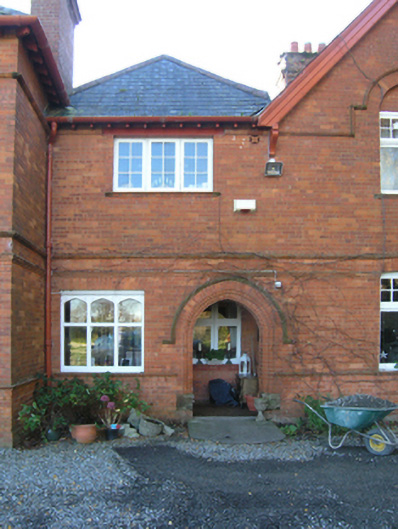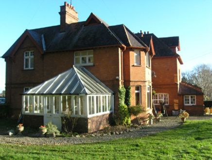 Detached three-bay two-storey Church of Ireland rectory with dormer attic, built 1891-2; occupied 1901, on a T-shaped plan with single-bay two-storey projecting end bay; three-bay (east) or two-bay (west) two-storey side elevations. Hipped (east) and gable-fronted (west) slate roofs centred on hipped slate roof, clay or terracotta ridge tiles, red brick English Garden Wall bond chimney stacks having "Cyma Recta"- or "Cyma Reversa"-detailed stringcourses below capping supporting terracotta tapered pots, timber bargeboards to gables on timber consoles, and cast-iron rainwater goods on exposed timber rafters retaining cast-iron downpipes. Part creeper- or ivy-covered red brick English Garden Wall bond walls. Pointed-arch central open internal porch with cut-granite step threshold, and thumbnail beaded rebated reveals with hood moulding. Tudor-headed door opening into rectory with cut-sandstone lintel having thumbnail beaded reveals framing nailed timber panelled door. Square-headed window openings in shallow camber-headed recesses (ground floor) with red brick or terracotta "Cavetto" sill courses, and red brick voussoirs centred on terracotta keystones with hood mouldings framing timber casement windows. Square-headed window openings in shallow camber-headed recesses (first floor) with red brick or terracotta "Cavetto" sills, and red brick voussoirs centred on terracotta keystones with hood mouldings framing timber casement windows. Set in landscaped grounds with ball finial-topped cast-iron colonette piers to perimeter supporting wrought iron railings.
