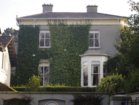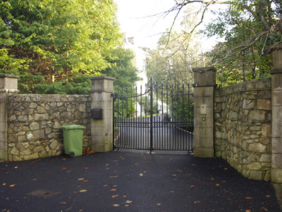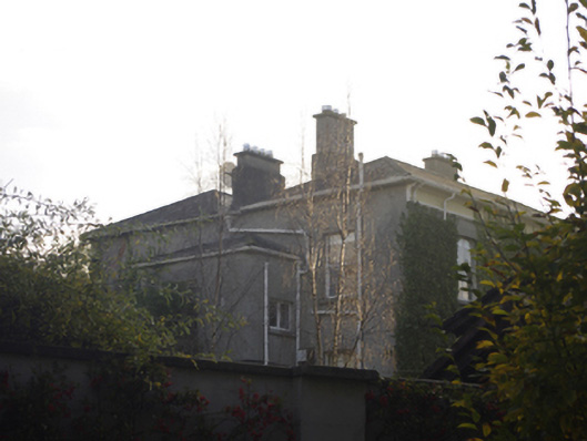 Detached three-bay (two-bay deep) two-storey over raised basement house, built 1865; extant 1871, on a T-shaped plan with single-bay (single-bay deep) two-storey lower central return (east). Occupied, 1911. Hipped slate roof on a U-shaped plan; hipped slate roof (east), clay ridge tiles, paired cement rendered central chimney stacks having concrete capping supporting terracotta pots, and replacement uPVC rainwater goods on slightly overhanging eaves on paired timber consoles on beaded stringcourse retaining cast-iron octagonal or ogee hoppers and downpipes. Part creeper- or ivy-covered rendered, ruled and lined walls on cushion course on rendered, ruled and lined base with rendered "bas-relief" quoined piers to corners. Round-headed central opening approached by flight of cut-granite steps with rendered "bas-relief" block-and-start surround having convex or rounded reveals. Pseudo three centre-headed flanking window openings in pseudo three centre-headed recesses with cut-granite sills supporting wrought iron balconettes, and rendered "bas-relief" block-and-start surrounds framing two-over-two timber sash windows. Pseudo three centre-headed window openings (first floor) with cut-granite sills, and rendered "bas-relief" block-and-start surrounds framing two-over-two timber sash windows. Pseudo three centre-headed window openings to side elevations with cut-granite sills, and concealed dressings framing two-over-two timber sash windows. Square-headed window openings to rear (east) elevation with cut-granite sills, and concealed dressings framing two-over-two timber sash windows. Interior including (ground floor): central hall retaining carved timber surrounds to door openings framing timber panelled doors; and carved timber surrounds to door openings to remainder framing timber panelled doors with timber panelled shutters to window openings. Set in landscaped grounds.