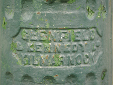 A "lion mask" water hydrant supplied by Glenfield and Kennedy (established 1852) of Kilmarnock representing an interesting example of mass-produced cast-iron work making a pleasing, if largely inconspicuous visual statement in a suburban street scene.
