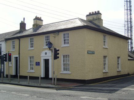 Attached three-bay two-storey Garda Síochána station, built 1926, on an L-shaped plan; two-bay two-storey side (west) elevation. Hipped slate roof on an L-shaped plan with clay ridge tiles, rendered chimney stacks on rendered bases having stepped capping supporting terracotta or yellow terracotta pots, slightly sprocketed eaves, and cast-iron rainwater goods on timber eaves boards on timber boarded eaves retaining cast-iron downpipes. Roughcast walls bellcast over rendered plinth. Square-headed central door opening with concrete threshold, and rendered surround framing glazed timber panelled door. Square-headed window openings with concrete sills, and concealed dressings framing six-over-six timber sash windows. Road fronted on a corner site with concrete brick cobbled footpath to front.